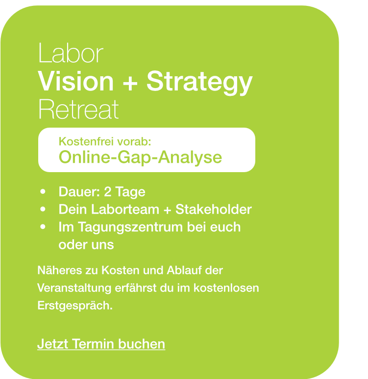 Im Workshop entwickeln wir eine Vision für die zukünftige Entwicklung eures Labors auf Grundlage eures Existenzzwecks, eures Purpose. Im Strategieteil bearbeiten wir eure aktuellen strategischen Fragen im Hinblick darauf, wie sie auf das Erreichen eurer Vision einzahlen. Neben strukturellen Handlungsfeldern spielen dabei auch eure Werte und eure Unternehmenskultur eine wichtige Rolle. Alle Schritte werden aus der Perspektive eurer wichtigsten Stakeholder überprüft. Die einzelnen Bausteine münden in die Formulierung eines Mission Statements für euer Labor. Abschließend werden Perspektiven aufgezeigt, wie der Praxistransfer der im Workshop erarbeiteten Grundlagen in den Laboralltag gelingen kann.